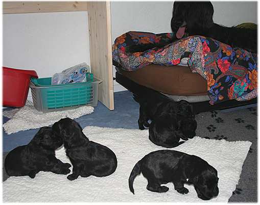 Unsere Patavientos sind jetzt genau 15 Tage alt und gedeien wunderbar! Wir alle, inklusive Opa Mel Paso, Tante Popèa, natürlich Ami mit Bea und Enzo haben so viel Freude und Spass mit den nun bereits sehr mobilen Welpen. Die Kleinen hören nun schon und sehen auch bereits etwas besser, so dass sie sich schon ganz eifrig auf uns stürzen zur Begrüssung und dabei erste Wedelaktionen machen. So süss!