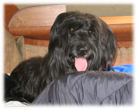 waren, verschwanden wir bereits um 8 Uhr unter der Bettdecke. Der nächste Morgen ging dann auch wieder um 6 Uhr los. Enzo besorgte sich die Startnummer fürs Agility. Wir begaben uns schon bald in die Hallen, die bereits schon wieder voll gestopft waren, heute schienen noch mehr Leute und Hunde anwesend zu sein. Wir hatten uns eine Kollektionsbox gemietet, damit wir die Hunde bei uns hatten und Enzo nicht ständig zum Camper stressen musste, regnete es doch den ganzen Tag in Ströhmen! So hatten die Beiden auch die Gelegenheit mal eine Runde in Ruhe schlafen zu können. Popèa's Auftritt im Open lief gleichzeitig wie das Richten der Briards, Enzo war der letzte Starter der Klasse 2, er holte nach der Parcoursbesichtigung Popèa und kämpfte sich durch die vielen Ausstellungshunde durch. Tatsächlich kam er zu spät an den Start, da es teilweise unmöglich war, dass er durch die Hunde durchkam, auf dem Weg dahin wurde Popèa sogar noch von einem Rottweiler gebissen, toll!! (Gott sei Dank nur eine kleine Fleischwunde!) Der Richter war aber sehr tolerant und liess Enzo mit Popèa in der Klasse 3 starten, der Lauf war ja derselbe! Wie irr und voll motiviert sind die beiden auf dem Teppichboden durch den Parcours gerauscht. Für Popèa war das Premiere auf Teppich, sie hat aber die neue Schwierigkeit super im Griff gehabt und mit einem Superlauf sind die beiden ins Ziel gerast. Grosser Applaus von den ungewohnt vielen Zuschauern hat natürlich nicht gefehlt, ist doch ein Briard der Gas gibt eine besondere Attraktion im Agility! Inzwischen war das Richten der Briards am Ring bereits zu Ende, der französische Richter war sehr entsetzt über die unkupierten Briards und hat Raya, die es natürlich auch verdient hat, das BOB (Rassenbester) übergeben. Herzliche Gratulation! Alle anderen Teilnehmer waren mehr entsetzt über die Beurteilung ihrer Hunde, mit Recht, denn schliesslich und endlich zahlen die Teilnehmer auch viel Geld für 5 Minuten im Ring zu stehen, da könnte man schon erwarten, dass ein anständiger Richterbericht geschrieben wird! Wir Briardiers amüsierten uns dann über die Kritiken und schon