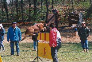 •     Hochsprung (1 m - 1.2 m): aus dem Stand wird der Hund über die Hürde geschickt, auf der anderen Seite nimmt er die vom Hundeführer gewünschte Position ein (Steh, Sitz, Platz), auf ein einziges Kommando hat er die Hürde zurück zu springen und sich unverzüglich an die Seite des Hundeführers (dieser steht neben dem Sprung) zu begeben.