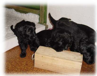 wie lange gehts wohl noch, bis die sehr vorwitzigen Welpen erste Ausbruchversuche machen!! Wenn Sie nach Papa kommen, dann nicht mehr allzulange!!!